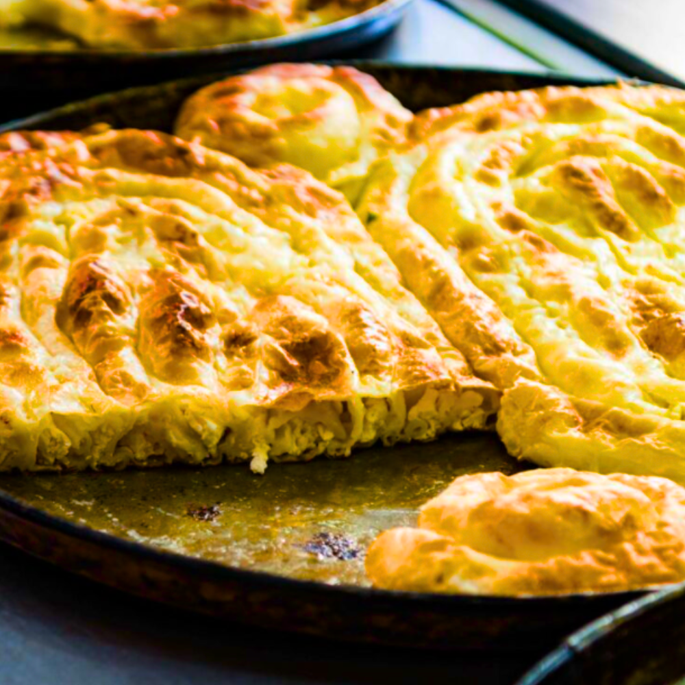 Pita: Handmade dough stretched into a paper-thin, translucent pastry, stuffed with cheese and rolled in a unique shape.