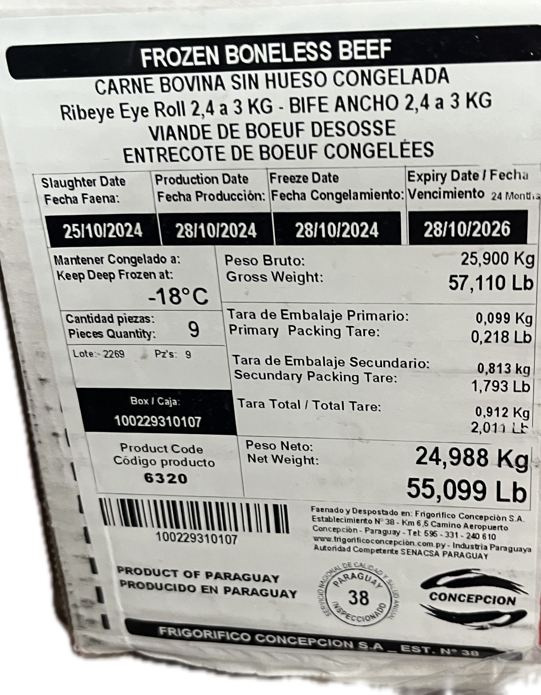 Beef Ribeye Roll Boneless Frozen 2.4kg to 3Kg